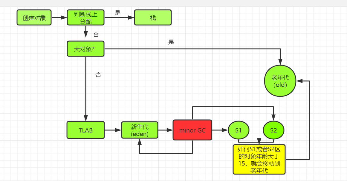 3. 通过TLAB(Thread local Allaction Buffer,本地线程分配缓存)分配空间后,就会进入新生代eden区,对象进入新生代后,会有eden区、survivor1(图中S1,内存中也叫to)区和 survivor2 (图中S2,内存也叫from)区;