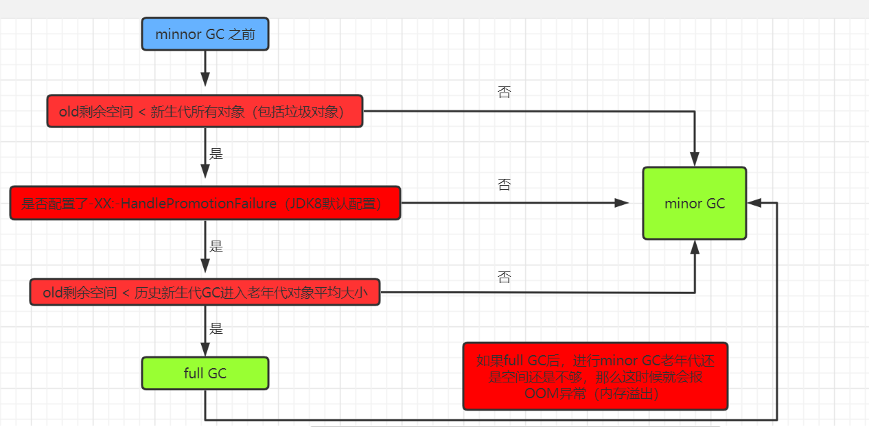 老年代空间分配担保:(发生在minor GC之前)老年代剩余空间与新生代的所有的对象(包括垃圾对象)进行比较,如果是大,就直接 minor GC,如果是小,那么此时就会看一下