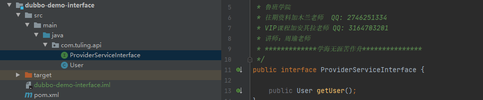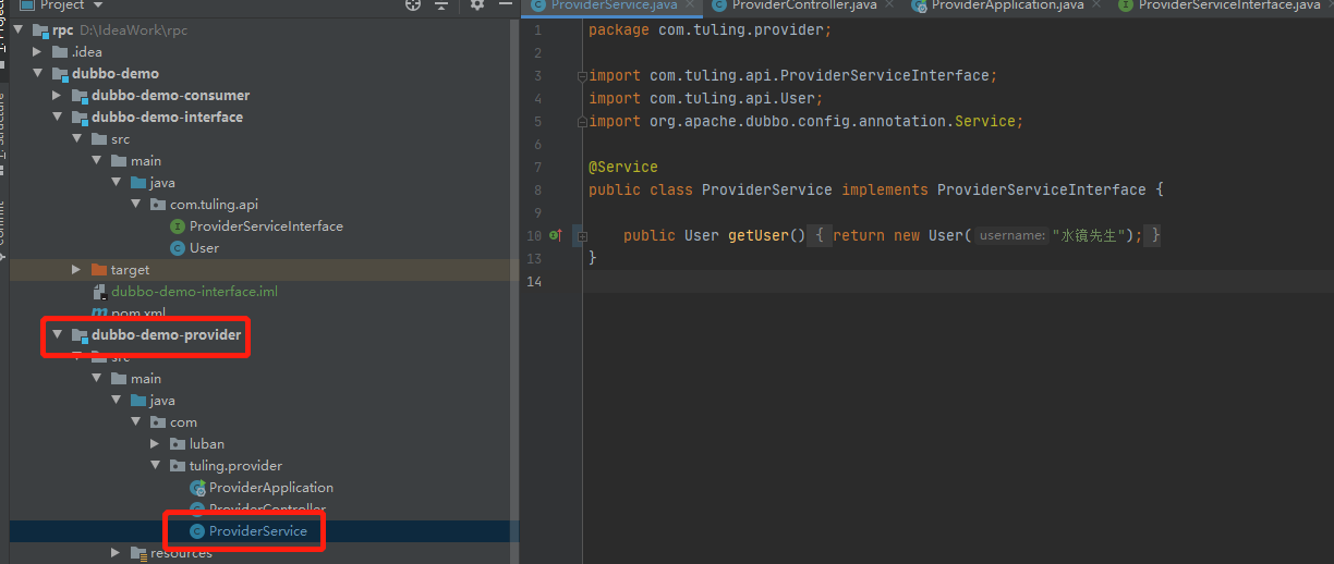 2、创建服务提供方(provider)提供服务类实现服务接口,本人demo就是当前服务就是返回了User对象名字为“水镜先生”