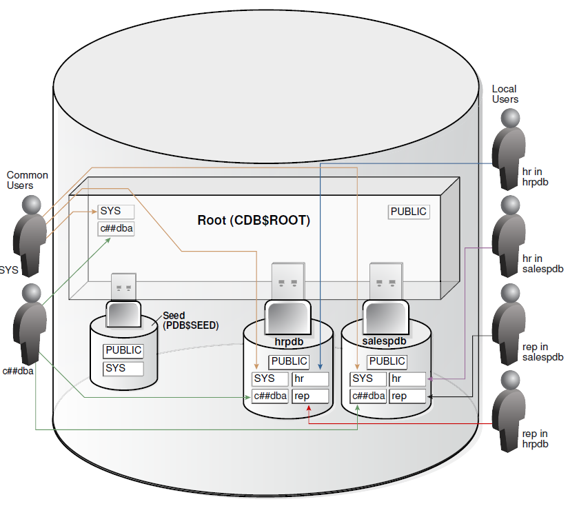 - 一个公共用户可以登录任意一个容器,只要它在这个容器中拥有CREATE SESSION的权限,包括CDB$ROOT。公共用户不必在每个PDB中都拥有一样的权限,比如说,c##dba在hrpdb和root中有create session权限,但在salespdb中没有,这是因为只要公共用户拥有恰当的权限,它就可以在不同容器之间切换,root中的公共用户可以管理其他PDB容器。