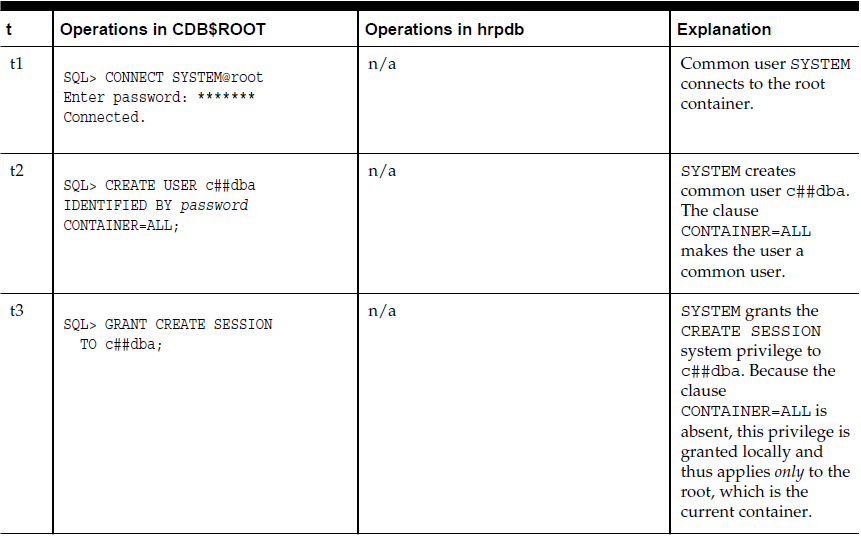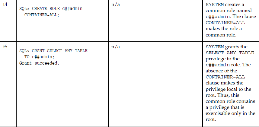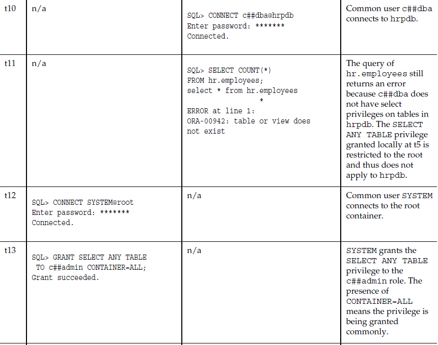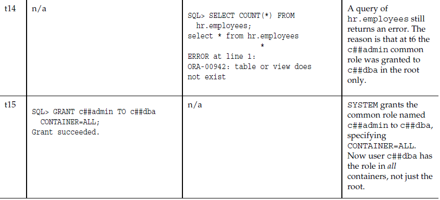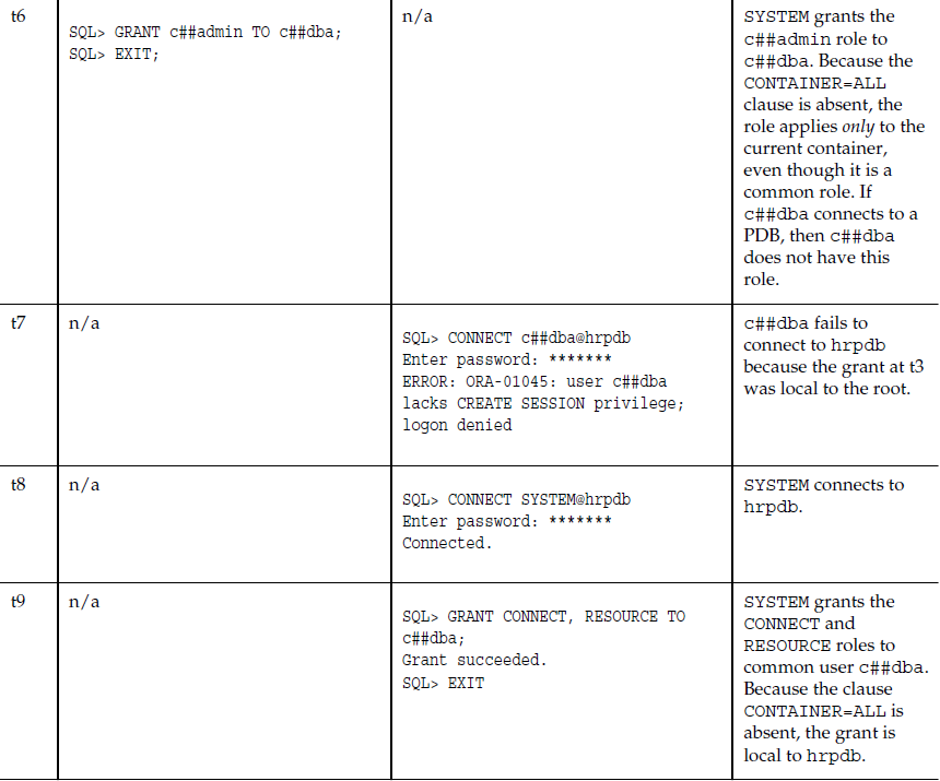 显示了CONTAINER子句是怎么影响所有角色和权限的授权的。第一列显示的是CDB$ROOT里的操作,第二列是hrpdb里的操作。