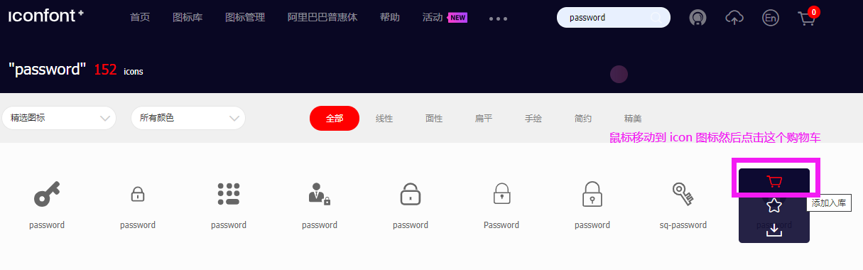 1、进入 icon 矢量库添加自己想要使用的图标到购物车(可多个一起添加)