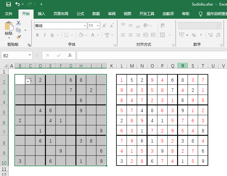 也可以求解Excel中的题目,下面讲述具体步骤。首先在Excel的B2:J10区域录入题目,然后用鼠标选中该区域,再返回到软件中点击菜单【文件】【求解Excel】