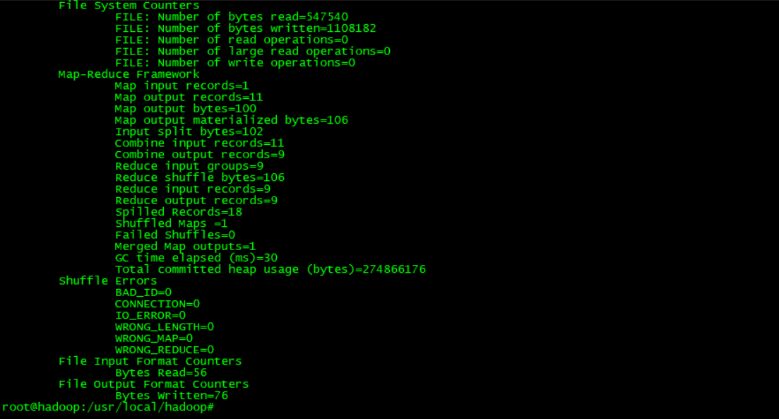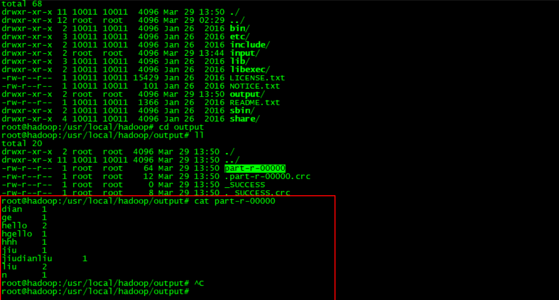 # ll //查看文件夹内容 #cd output //进入output文件 # ll ...... # cat part-r-00000 //打开part-r-00000文件