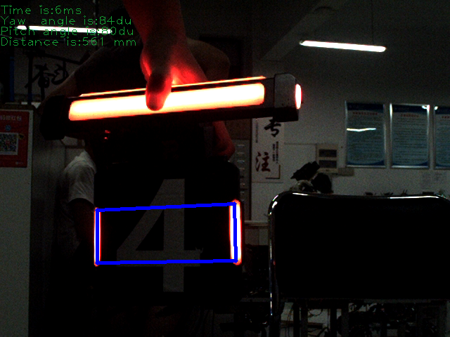 solvePNP算法进行姿态解算时,通常至少需要目标的三个顶点(这里是四个),为了更加精确的求出相关参数,代码通过单独求每个灯柱的顶点(底边中心点)来作为装甲板的顶点,大大提高了所得距离及pitch,yaw轴角度的精度。(以往总是以包围装甲区域的最小旋转矩形的顶点作为装甲区域的顶点。)测距精度3m内误差<2cm