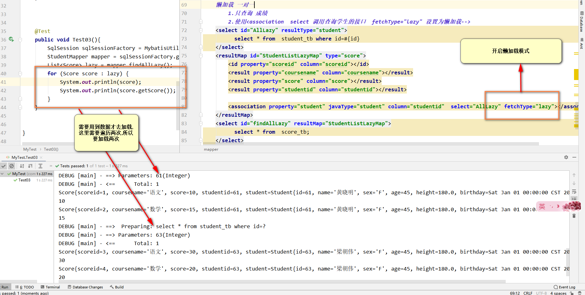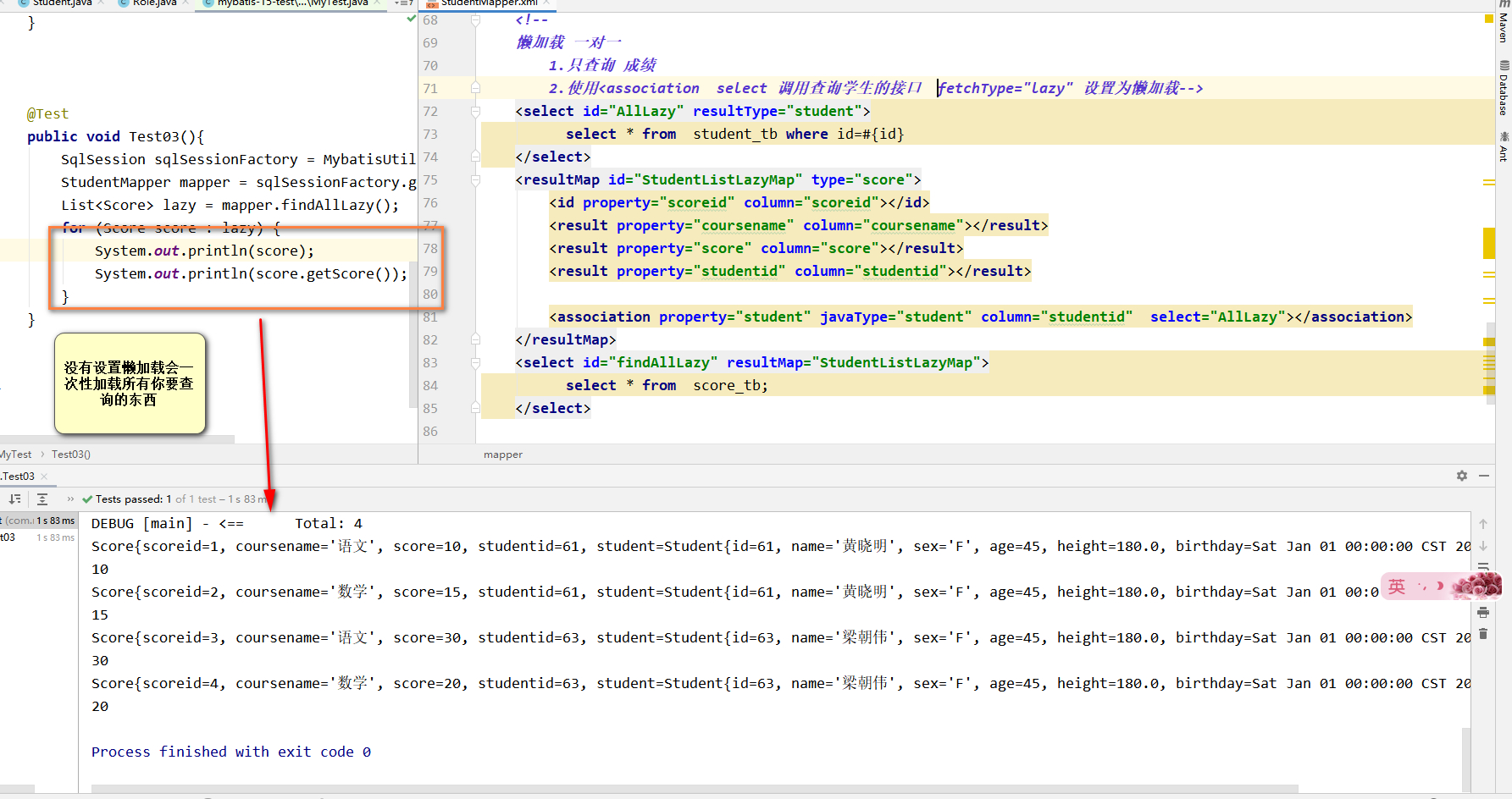 2.使用<association select 调用查询学生的接口 fetchType="lazy" 设置为懒加载-->