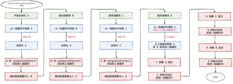 ○ 属性的循环依赖:在构造器执行的时候为完成属性的注入,而在调用方法的时候已经完成了注入。