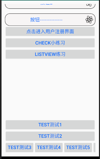 <?xml version="1.0" encoding="utf-8"?> <ScrollView xmlns:android="http://schemas.android.com/apk/res/android" android:layout_width="match_parent" android:layout_height="match_parent" android:padding="15dp"> <LinearLayout android:layout_width="match_parent" android:layout_height="match_parent" android:orientation="vertical"> <Button android:id="@+id/btn_1" android:layout_width="match_parent" android:layout_height="wrap_content" android:background="@drawable/bg_btn4" android:text="翠翠你好"/> <Button android:id="@+id/btn_2" android:layout_width="match_parent" android:layout_height="wrap_content" android:text="点击进入登陆界面" android:textSize="20sp" android:textColor="#0066FF" /> <Button android:id="@+id/btn_3" android:layout_width="match_parent" android:layout_height="wrap_content" android:text="按钮2" android:drawableRight="@drawable/science" android:background="@drawable/button_shape" android:textSize="20sp" android:textColor="#0066FF" android:layout_marginTop="20dp" android:onClick="showToast" /> <Button android:id="@+id/btn_4" android:layout_width="match_parent" android:layout_height="wrap_content" android:text="按钮--------------" android:drawableRight="@drawable/science" android:background="@drawable/button_shape" android:textSize="20sp" android:textColor="#0066FF" android:layout_marginTop="20dp" android:onClick="showToast1" /> <Button android:id="@+id/btn_zhuce" android:layout_width="match_parent" android:layout_height="wrap_content" android:text="点击进入用户注册界面" android:textSize="20sp" android:textColor="#0066FF" /> <Button android:id="@+id/btn_check" android:layout_width="match_parent" android:layout_height="wrap_content" android:text="check小练习" android:textSize="20sp" android:textColor="#0066FF" /> <Button android:id="@+id/btn_listview" android:layout_width="match_parent" android:layout_height="wrap_content" android:text="listview练习" android:textSize="20sp" android:textColor="#0066FF" /> <Button android:id="@+id/btn_test1" android:layout_width="match_parent" android:layout_height="wrap_content" android:text="test测试1" android:textSize="20sp" android:layout_marginTop="250dp" android:textColor="#0066FF" /> <Button android:id="@+id/btn_test2" android:layout_width="match_parent" android:layout_height="wrap_content" android:text="test测试2" android:textSize="20sp" android:textColor="#0066FF" /> <HorizontalScrollView android:layout_width="match_parent" android:layout_height="match_parent"> <LinearLayout android:layout_width="wrap_content" android:layout_height="wrap_content" android:orientation="horizontal"> <Button android:id="@+id/btn_test3" android:layout_width="match_parent" android:layout_height="match_parent" android:text="test测试3" android:textSize="20sp" android:textColor="#0066FF" /> <Button android:id="@+id/btn_test4" android:layout_width="match_parent" android:layout_height="match_parent" android:text="test测试4" android:textSize="20sp" android:textColor="#0066FF" /> <Button android:id="@+id/btn_test5" android:layout_width="match_parent" android:layout_height="match_parent" android:text="test测试5" android:textSize="20sp" android:textColor="#0066FF" /> <Button android:id="@+id/btn_test6" android:layout_width="match_parent" android:layout_height="match_parent" android:text="test测试6" android:textSize="20sp" android:textColor="#0066FF" /> </LinearLayout> </HorizontalScrollView> </LinearLayout> </ScrollView>