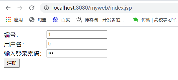 <%@ page language="java" import="java.util.*" pageEncoding="UTF-8"%> <% String path = request.getContextPath(); String basePath = request.getScheme()+"://"+request.getServerName()+":"+request.getServerPort()+path+"/"; %> <!DOCTYPE HTML PUBLIC "-//W3C//DTD HTML 4.01 Transitional//EN"> <html> <head> <base href="<%=basePath%>"> <title>My JSP 'index.jsp' starting page</title> <meta http-equiv="pragma" content="no-cache"> <meta http-equiv="cache-control" content="no-cache"> <meta http-equiv="expires" content="0"> <meta http-equiv="keywords" content="keyword1,keyword2,keyword3"> <meta http-equiv="description" content="This is my page"> <!-- <link rel="stylesheet" type="text/css" href="styles.css"> --> </head> <body> <form name="form1" method="post" action="control.jsp" > <table> <tr> <td>编号:</td> <td> <input type="text" name="sid" id="userName" ></td> </tr> <tr> <td>用户名:</td> <td> <input type="text" name="uname" id="userName" ></td> </tr> <tr> <td>输入登录密码:</td> <td><input type="password" name="upwd" id="pwd"></td> </tr> <tr> <td colspan="2"><input type="submit" value="注册"></td> </tr> </table> </form> </body> </html>