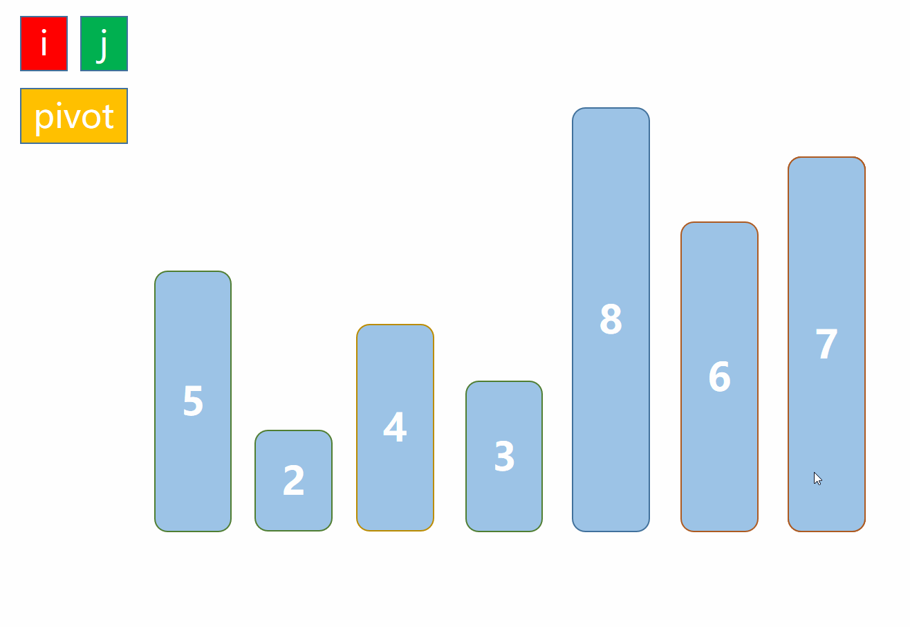 - 首先确定基准值,用索引\(i\)从左边寻找第一个比基准值大的元素、用索引\(j\)从右边开始寻找第一个比基准值小的元素,交换\(i,j\)索引处的值。如果\(i,j\)相遇,说明找到了基准值的位置,将基准值交换到该位置。以此位置分成两段进行递归
