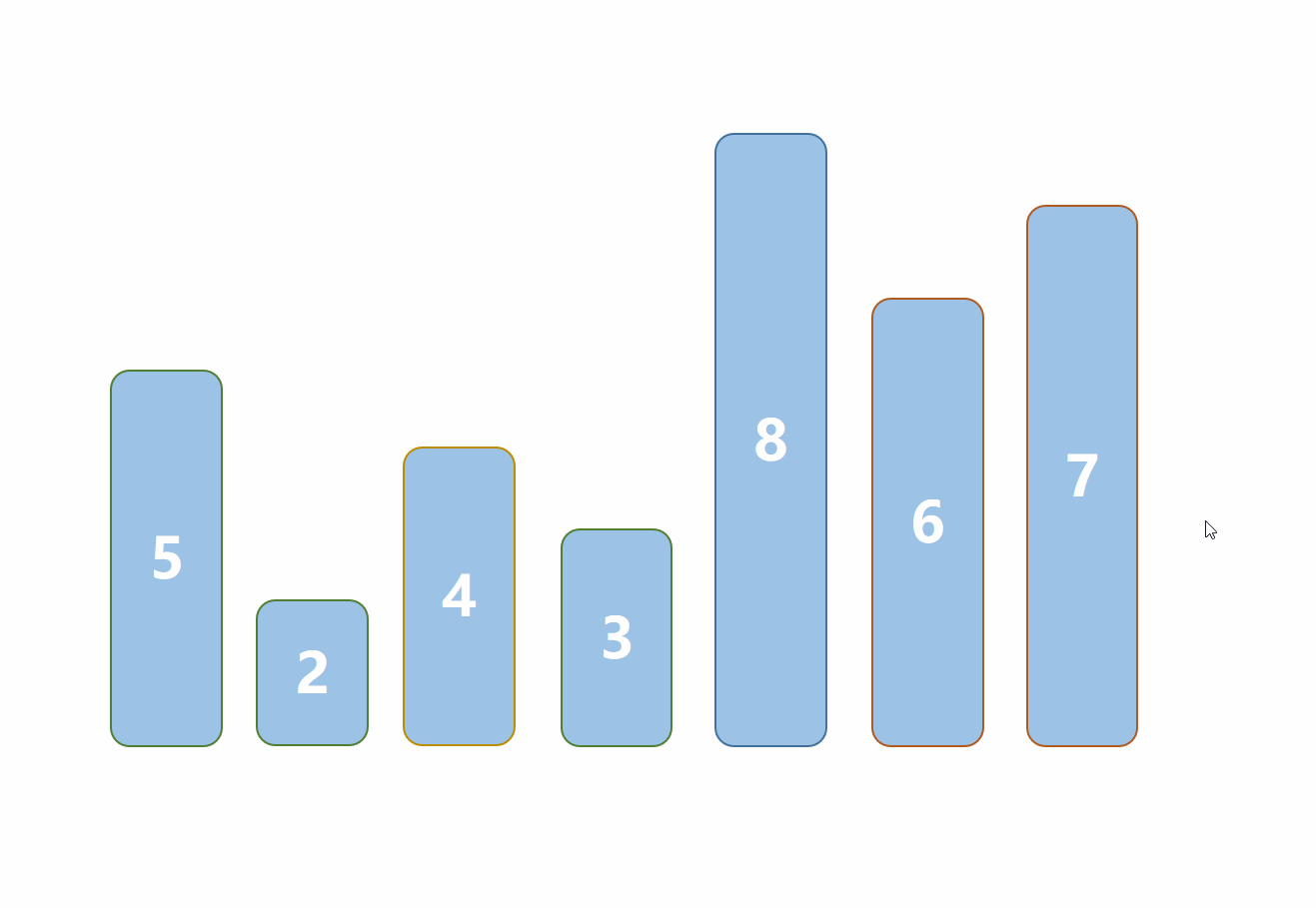 - 重复上述步骤,直到序列被分成单独的一个元素,这样位置一定是正确的