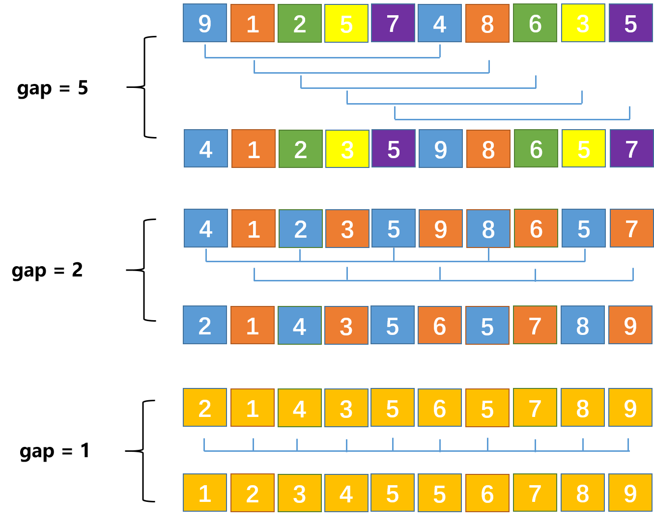 增量设定为数组的一半,每轮下去依次减半,对序列\(9\,1\,2\,5\,7\,4\,8\,6\,3\,5\)执行排序,情况如下
