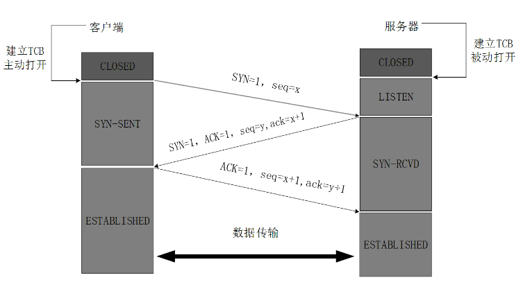 4, TCP客户端进程收到确认后还, 要向服务器给出确认。确认报文的ACK=1,确认序号是 y+1,自己的序列号是 x+1.