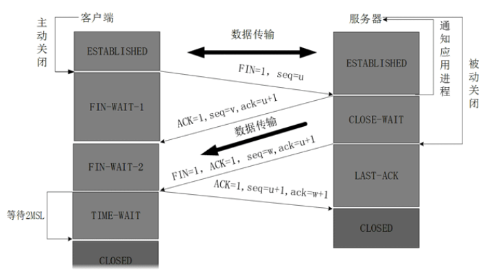 释放数据报文首部,FIN=1,其序列号为seq=u(等于前面已经传送过来的数据的最后一个字节的序号加1),此时客户端进入FIN-WAIT-1(终止等待1)状态。 TCP规定,FIN报文段即使不携带数据,也要消耗一个序号。