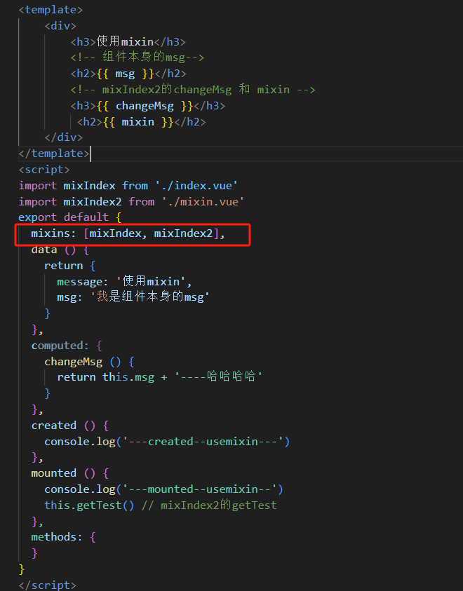 (3)一个组件可以混入多个mixin对象,当多个混入对象中有属性名冲突时,则后引入的会覆盖前面引入的;但是钩子函数不会被覆盖,仍然全部都被调用,且按混入的先后顺序被调用