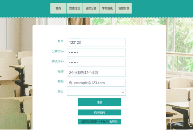 用户右上角“注册”按钮进入注册页面填写账号、密码、确认密码、昵称、邮箱、身份、姓名、性别等信息后点击“注册”按钮,系统将会先验证输入的有没有空数据,再次验证密码和确认密码是否是一样的,最后验证输入的账户名和数据库表中已经注册的账户名是否重复,只有验证通过后方可完成注册
