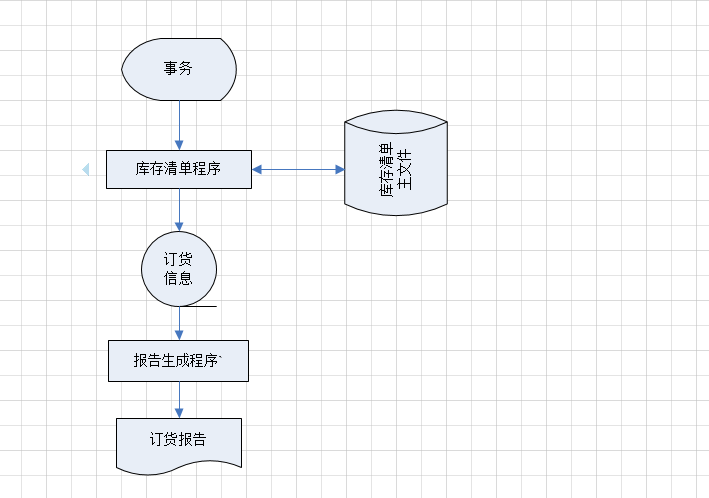 库中的CRT终端输入到计算机中;系统中的库存清单程序对事务进行处理,更新存储在磁盘上的库存清单主文件,并且把必要的订货