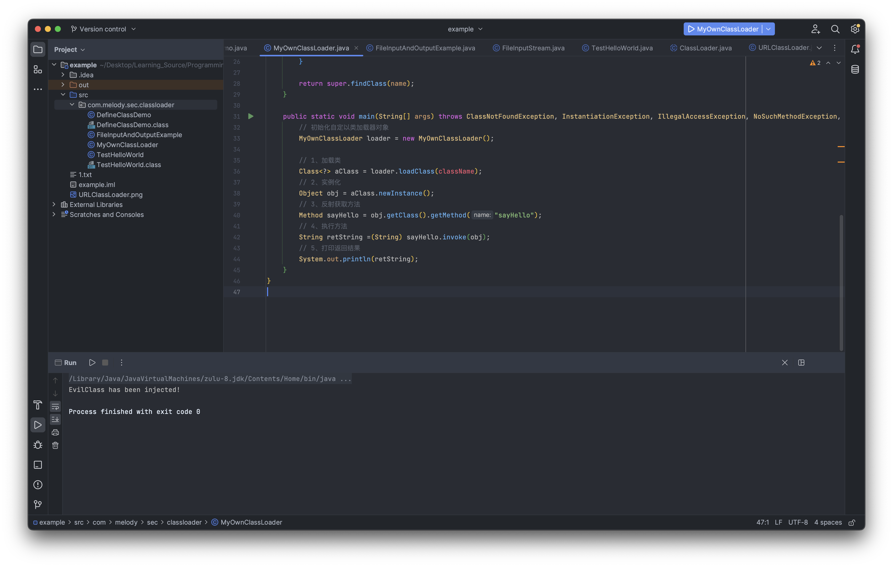 我们自定义的类加载器的思路是,假设我们的类路径下并没有这个EvilClass类,正常情况下使用类加载器去加载时一定会显示类名不存在的错误,我们的自定义类加载器若收到类名为EvilClass时,却可以正常的加载到JVM中。
