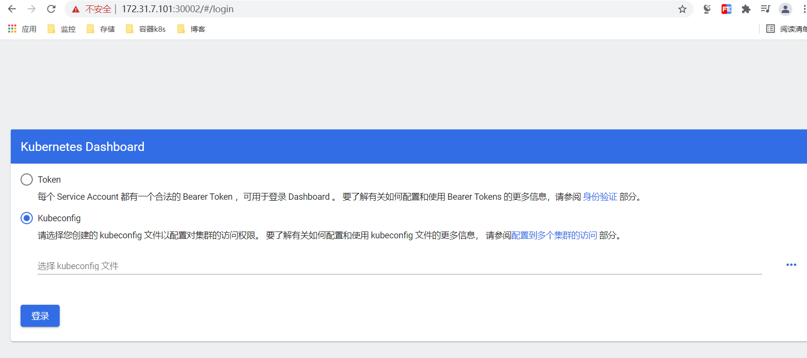 然后下载kubeconfig到客户端电脑,使用浏览器登录https://172.31.7.101:30002时,选择kubeconfig 文件登录。