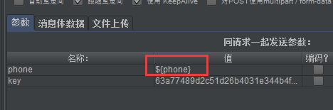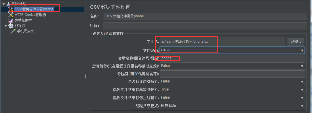 先建立csv数据文件设置,按照图中操作,文件需在本里文档进行建立,查手机号文档里写入两个手机号进行查询。变量名称决定了参数值的代码,写一样就行了,线程组设置循环两次就好了。