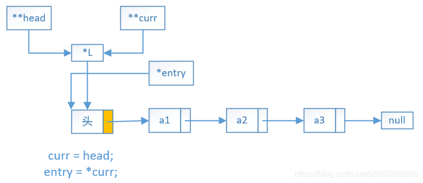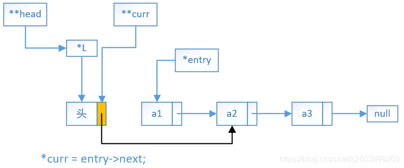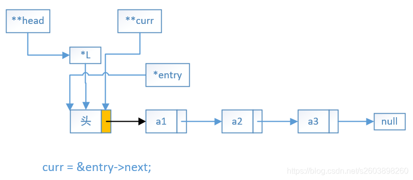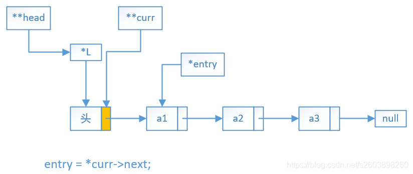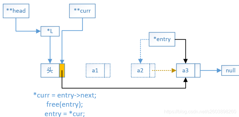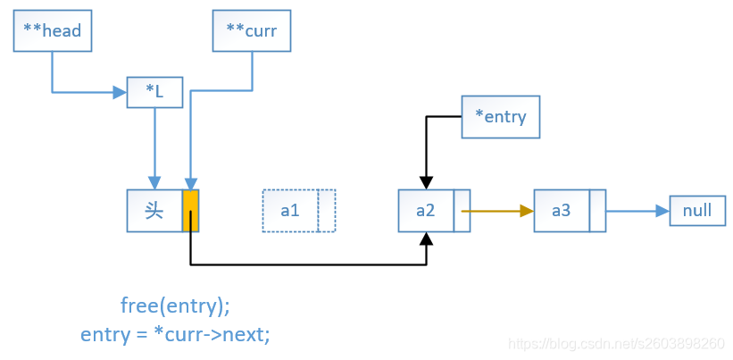 * 上述代码的执行效果是:二级指针cur指向头结点的指针域,每次判断如果不是头结点,则更改头结点指针域的值,即将头结点的指针通过entry指向下一个节点,然后释放entry节点。再次循环时,将头结点指针域的值给entry,即entry指向下一个节点,如此循环... ...