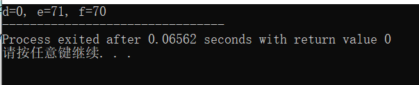 #include <stdio.h> int main(){ int a=5,b=7,c=100,d,e,f; d=a/b*c; e=a*c/b; f=c/b*a; printf("d=%d, e=%d, f=%d",d,e,f); return 0; }
