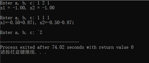 printf("x1=%.2f+%.2fi, x2=%.2f-%.2fi\n\n",real,imag,real,imag);