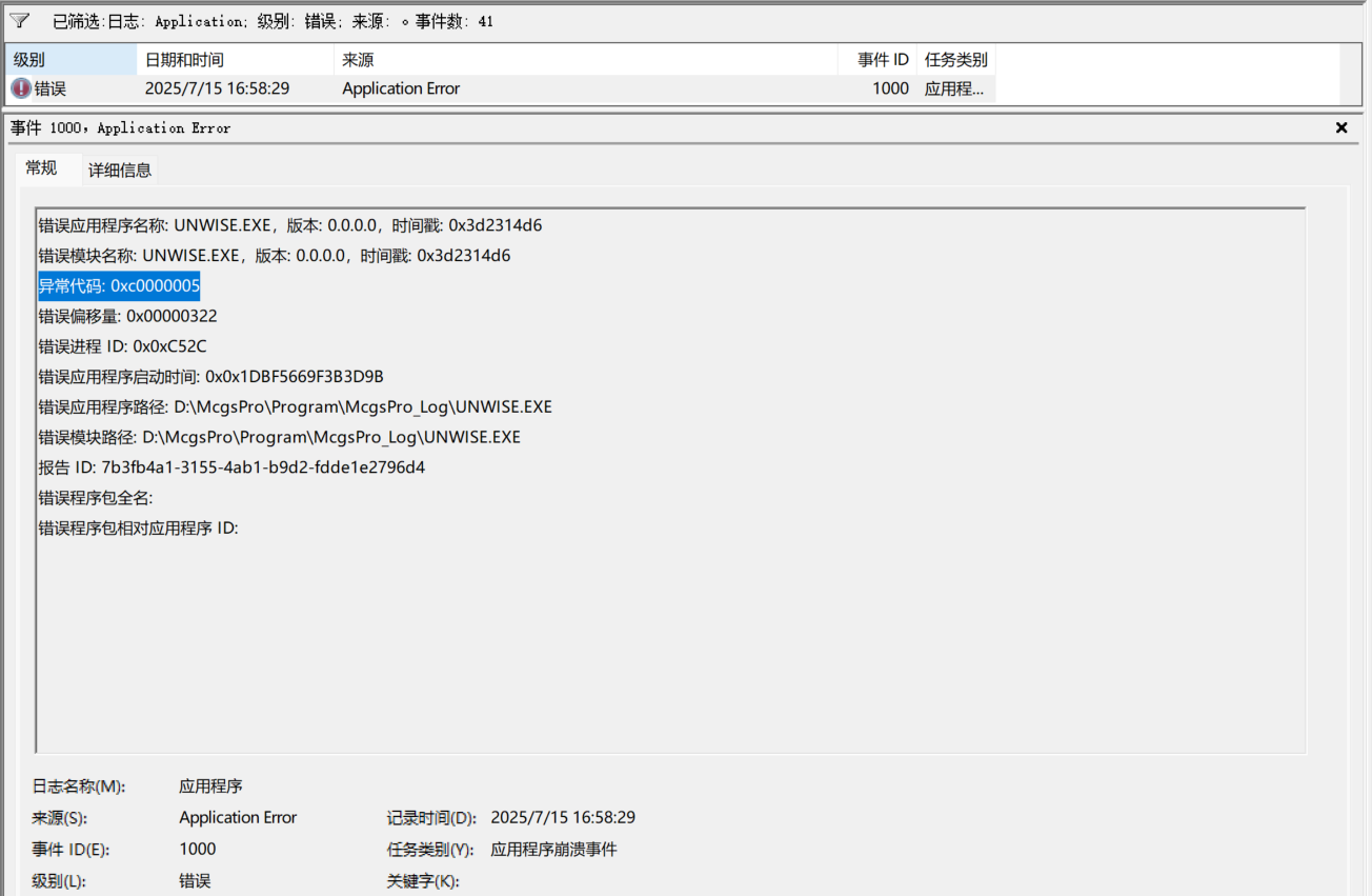 利用事件查看器查看Windows日志中的应用程序日志,有以下信息