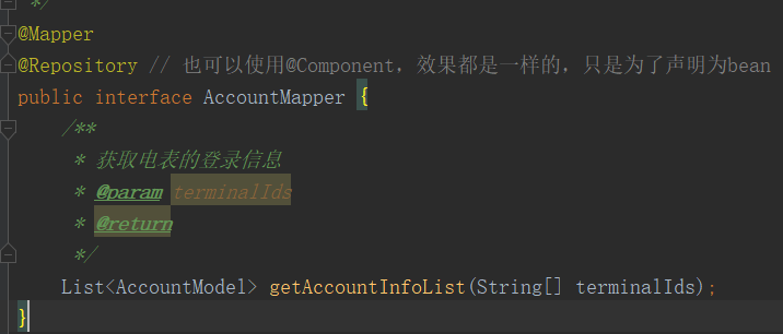 @Repository: 仅仅使用@Mapper注解,我们会发现,在其他变量中依赖注入,IDEA 会提示错误。因为我们没有显式标注这是一个 Bean,用@Repository注解声明这是一个bean.