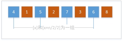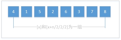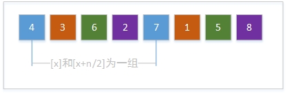 例如有4, 3, 6, 2, 7, 1, 5, 8八个数字,第一次分成四组,即8/2组。如下图,相同颜色的数字为一组,下标为x的数字和下标为x+4的数字为一组。