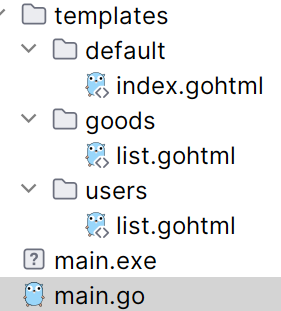 {{define "goods/list.gohtml"}} <!DOCTYPE html> <html lang="en"> <head> <meta charset="UTF-8"> <title>Title</title> </head> <body> <h1> {{.title}}</h1> </body> </html> {{end}}