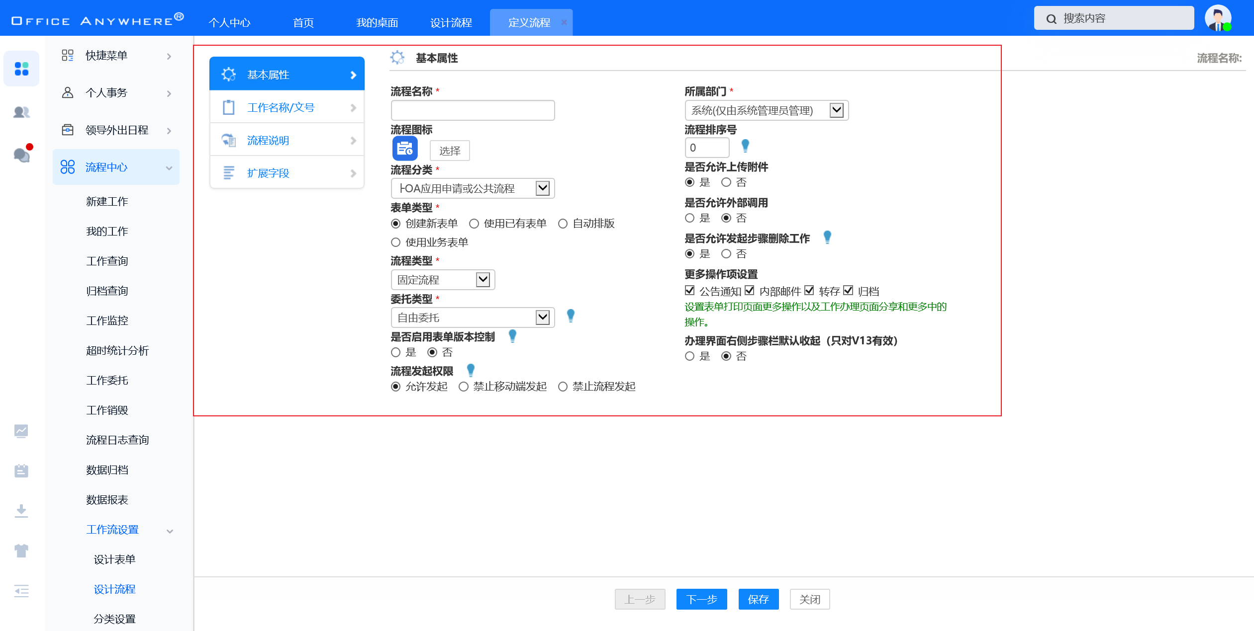 2、填写流程名称,选择流程分类、流程类型(本说明以固定流程为例)、所属部门、流程排序号等,工作名称和文号根据您的需要进行撰写表达式,若需要填写该流程的工作名称/文号、流程说明等,可以通过点击“下一步”按钮进入,若不需要,则可直接保存流程。如图所示。