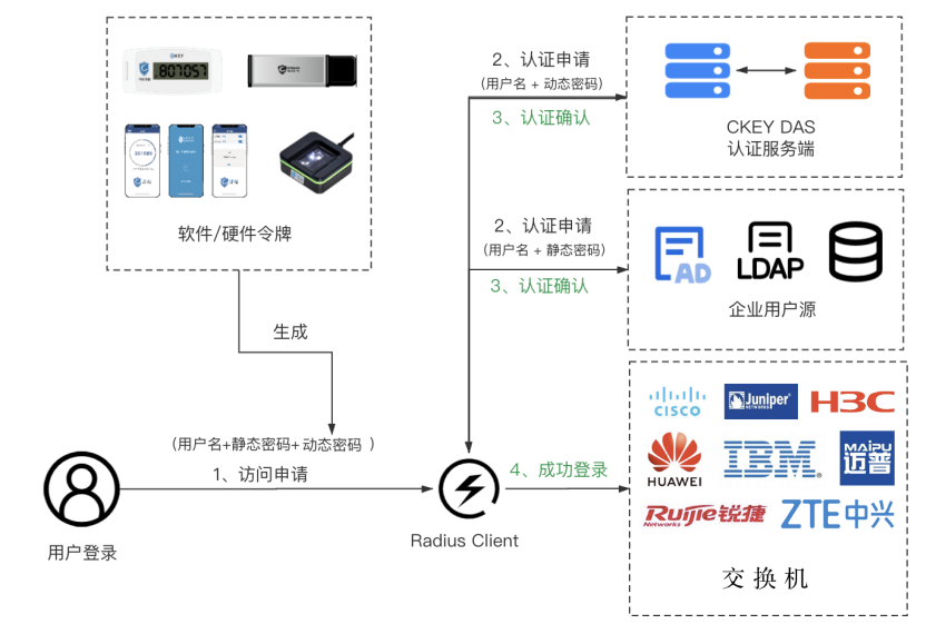 2、目标主机通过Radius Client同时将用户名+静态密码发送到企业用户源做静态认证、将用户名+动态密码发送到CKEY DAS认证服务器做动态认证;