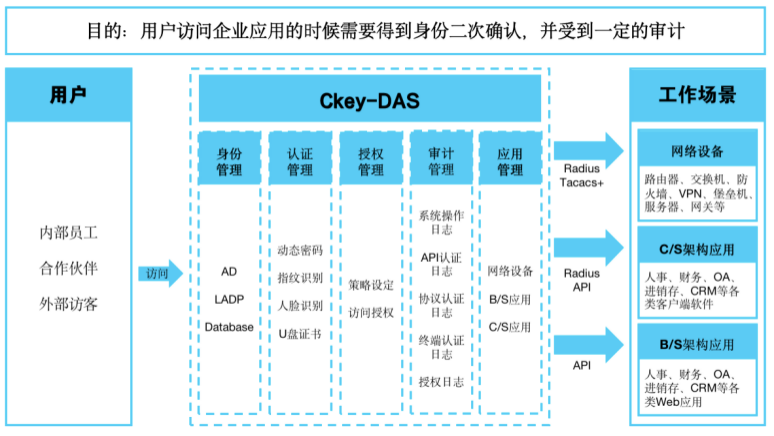 Ckey-DAS支持标准的Radius、Tacacs+协议,支持所有此协议设备,并且支持SDK、API集成方式对接,基本满足企业所有业务系统,特殊情况下还支持源代码集成。  |
