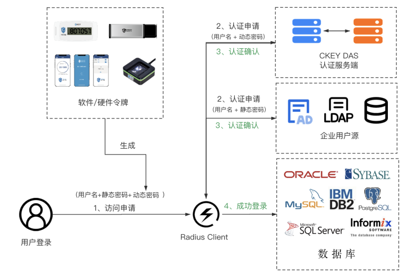 2、目标主机通过Radius Client同时将用户名+静态密码发送到企业用户源做静态认证、将用户名+动态密码发送到CKEY DAS认证服务器做动态认证;