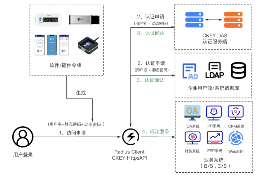 2、目标主机通过Radius Client或API同时将用户名+静态密码发送到企业用户源做静态认证、将用户名+动态密码发送到CKEY DAS认证服务器做动态认证;