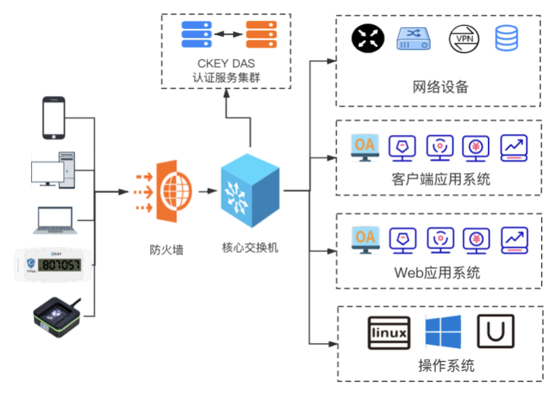 CKEY DAS(中科恒伦双因素认证系统)基于标准的Radius协议和TACACS+协议,为网络设备、业务系统、操作系统提供身份认证、授权和审计,同时支持API、SDK对接方式,满足所有主流场景。