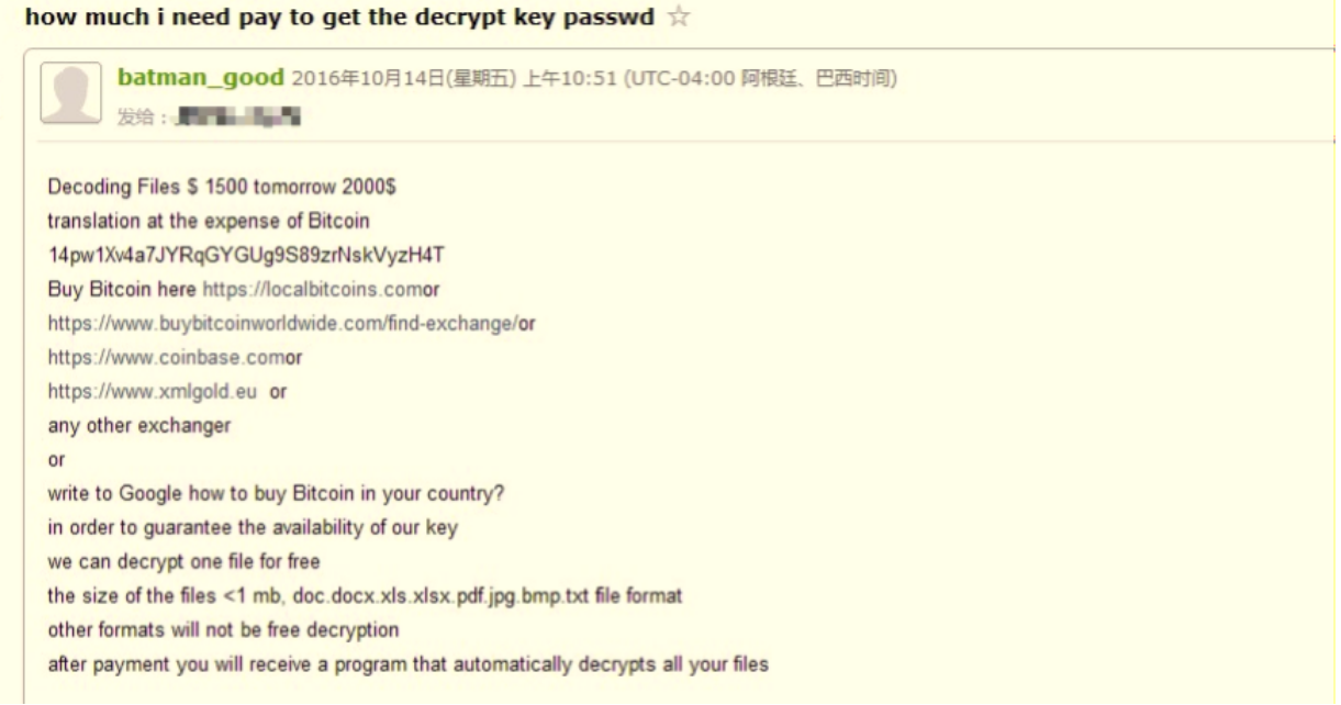 图4.按照勒索者留下的联系方式得到赎金信息