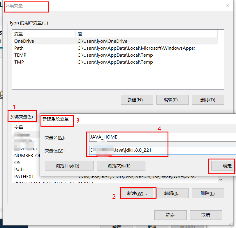 "新建系统变量"下输入:变量名`JAVA_HOME`,变量值`D:\...\jdk1.8.0_221`JDK安装路径 d. 编辑"Path"变量