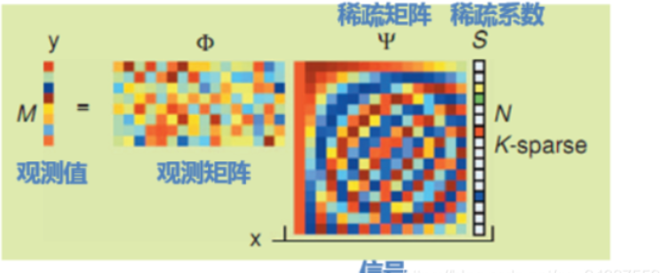从右到左,是采样的过程,已知 Φ 和 x 求解 y ,对于原始信号,我们通过观测矩阵所描述的观测(采样)方式,从而获得了观测值(采样值)。当我们处理信号为稀疏信号时,那么便可以保证在采样阶段,观测值的数据量是远小于原始信号。