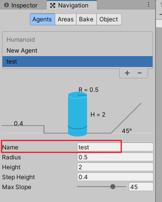 var count = NavMesh.GetSettingsCount(); Debug.Log($"ct1: {count}"); for (var i = 0; i < count; ++i) { var settings = NavMesh.GetSettingsByIndex(i); var settingsName = NavMesh.GetSettingsNameFromID(settings.agentTypeID); Debug.Log($"id: {settings.agentTypeID}, name: {settingsName}"); if ("test" == settingsName) { NavMesh.RemoveSettings(settings.agentTypeID); --i; } } Debug.Log($"ct2: {count}");