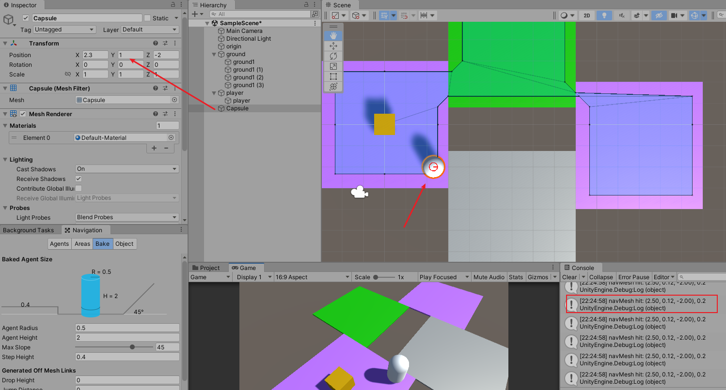 public class NavMeshTest : MonoBehaviour { public NavMeshAgent _agent; public Transform _capsule; public float _distance = 1.0f; void Update() { if (Input.GetKey(KeyCode.Alpha1)) { var srcPosition = _capsule.position; if (NavMesh.SamplePosition(srcPosition, out var hit, _distance, NavMesh.AllAreas)) { Debug.Log($"hit: {hit.position}"); Debug.DrawLine(srcPosition, hit.position, Color.red); } } } }