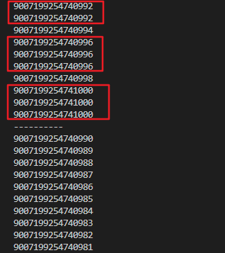 可以看到,超过后会出现重复的结果,原因就是精度开始丢失,算出的结果不精确了。而最大数之前的数字,不会重复都是精确的。