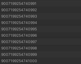 local a = 9007199254740991 for i=1,10 do print(string.format("%.0f", (a+i))) end print("----------") for i=1,10 do print(string.format("%.0f", (a-i))) end