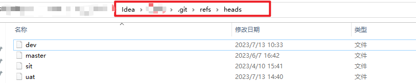 目录为:项目路径\.git\refs\heads 下面可以看到本地分支信息,将远程已删除分支同名文件删除 (我本地文件夹内容如下,多余的本地分支同名文件已删除)