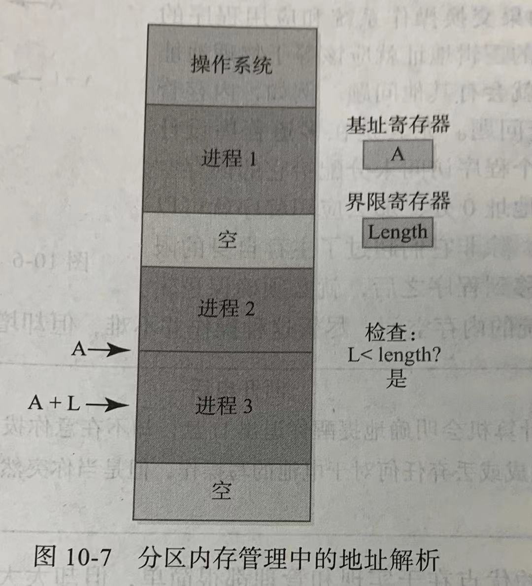 固定分区和动态分区的地址联编基本上是一样的。与单块内存管理法一样,逻辑地址是相对于0起始点的整数,OS处理地址转换细节的方式有很多,一种方法是使用CPU中的两个专用寄存器帮助管理寻址,当CPU开始运行一个程序时,OS把程序的分区起始地址储存到基址储存器中(base register),同时,分区的长度将被存入界限储存器(bounds register)。