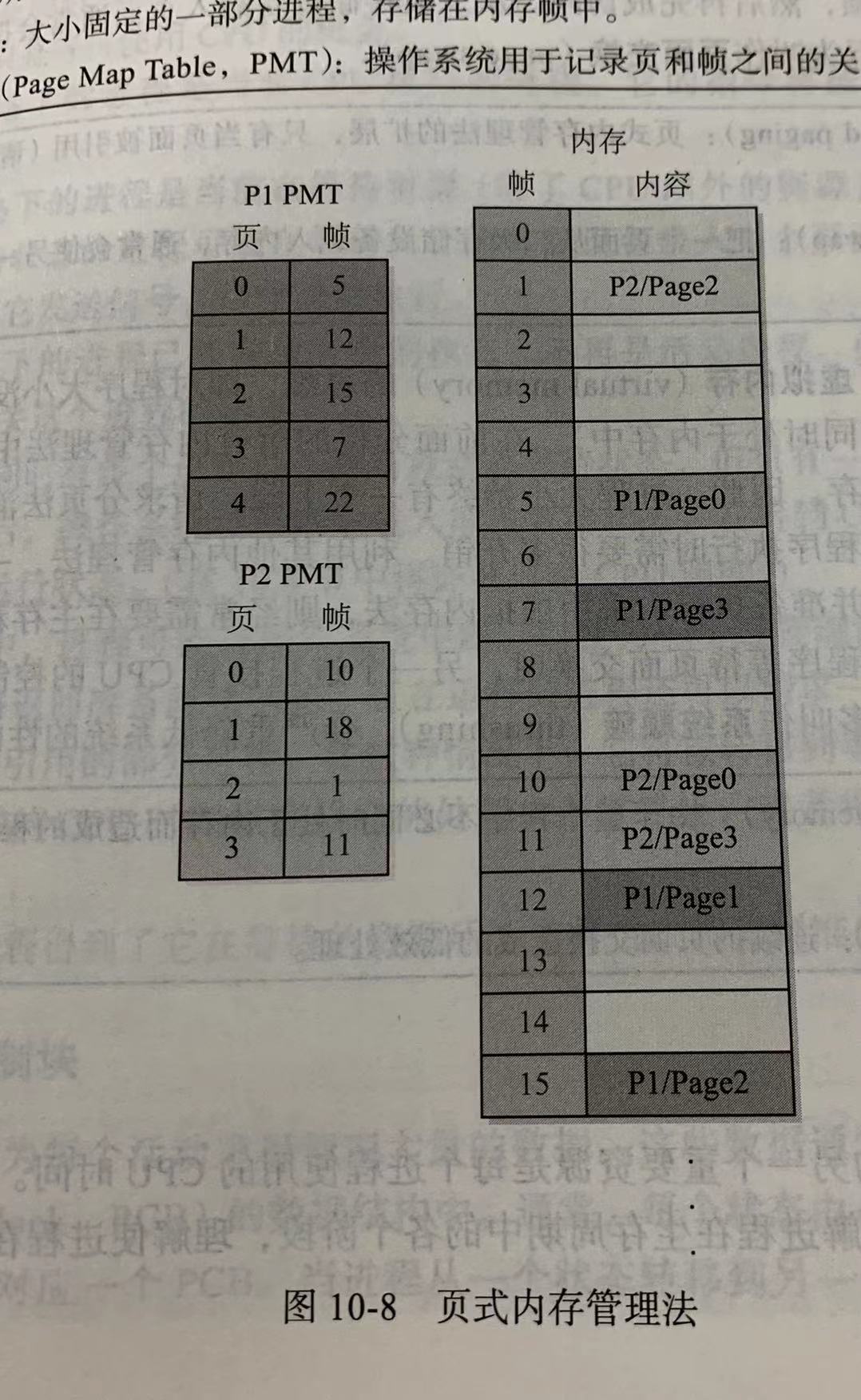 页面内存管理法(paged memory technique):把进程划分为大小固定的页,载入内存时存储在帧中的内存管理方法;