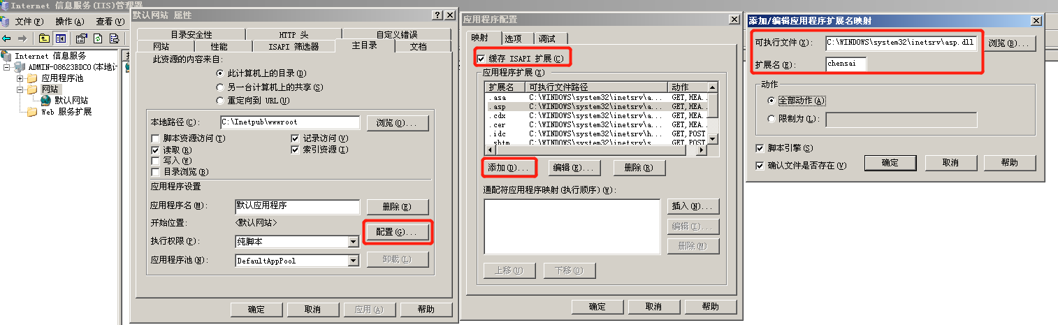 1、IIS6.0文件名解析配置,新增一个后缀解析.chensai利用asp解析,配置完后网站下面所有.chensai程序都会解析asp