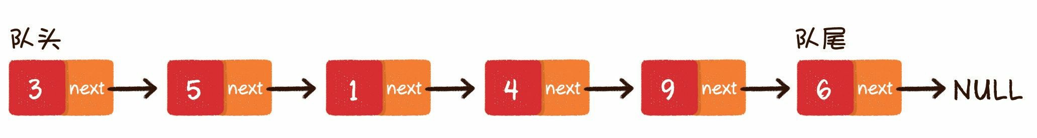 队列(queue)是一种线性数据结构,它就相当于排队。与排队的特点一样,队列中的元素先入先出。队列的出口端叫作队头(front),队列的入口端叫作队尾(rear)。