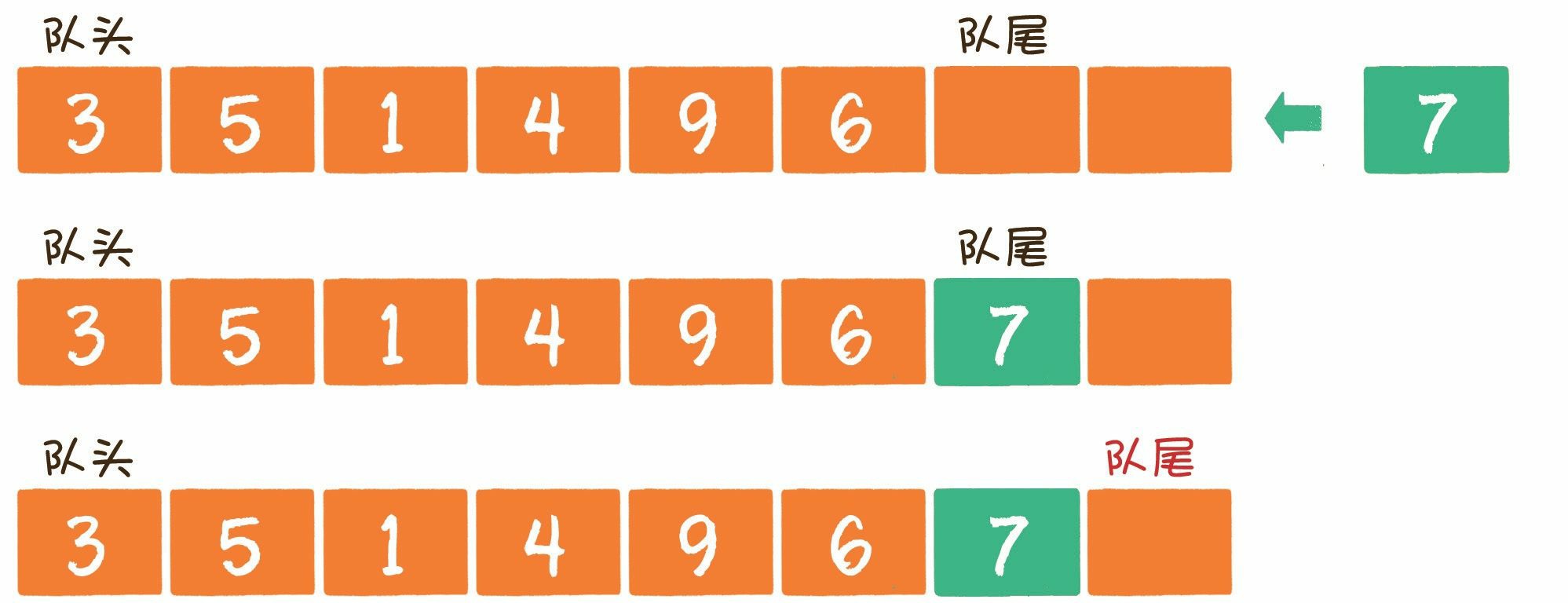 入队(enqueue)就是把新元素放入队列中,只允许在队尾的位置放入元素,新元素的下一个位置将会成为新的队尾。